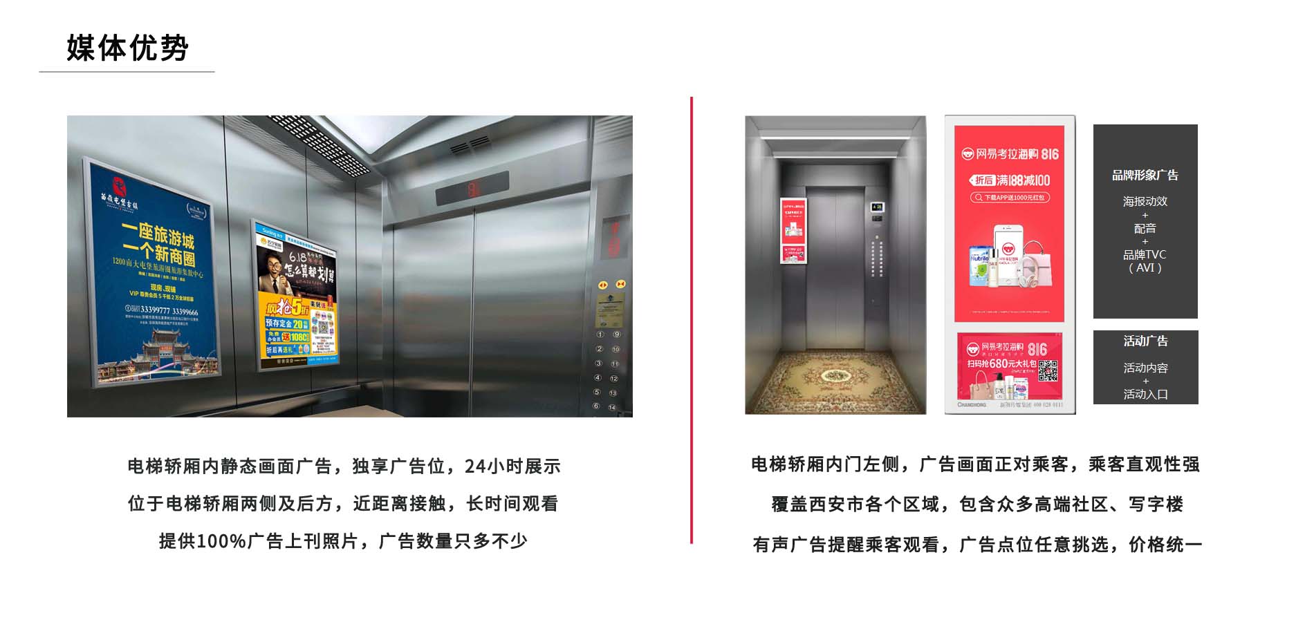 - 本地深耕 16 年,深耕西安电梯媒体市场,掌握核心资源,点位覆盖密度与质量领先;